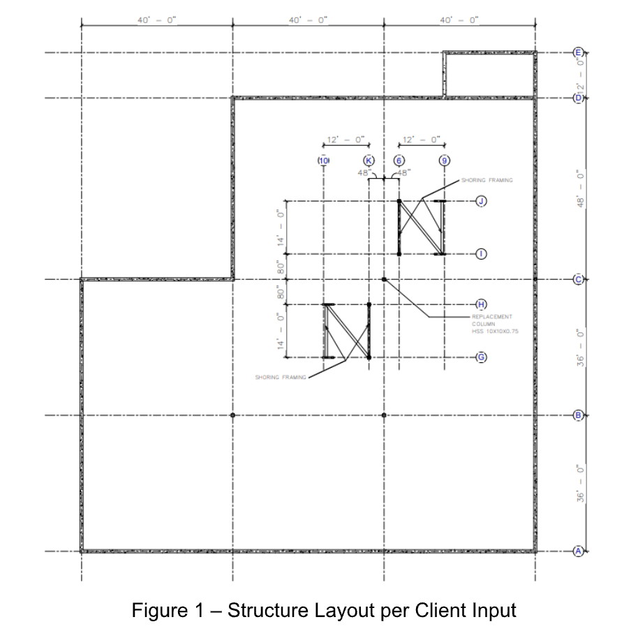 The temporary shoring system consists of a free-standing, braced steel frame designed to support the existing roof and superstructure during removal and replacement of the damaged column. Two identical shoring frames are utilized, installed symmetrically on both sides of the column, each located approximately 2 feet from the column centerline.