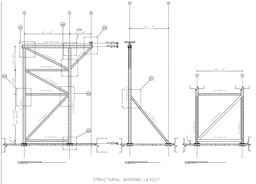 Shoring columns bear on the existing slab-on-grade through steel base plates designed to transfer axial loads without overstressing the slab. All members act together as a three- dimensional braced frame capable of resisting gravity and construction-induced lateral forces.
