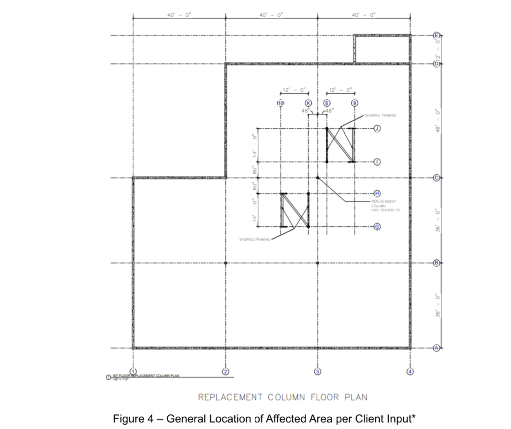 The column replacement and temporary shoring were therefore limited to this defined area to stabilize the structure, protect adjacent framing, and prevent progression of structural distress.