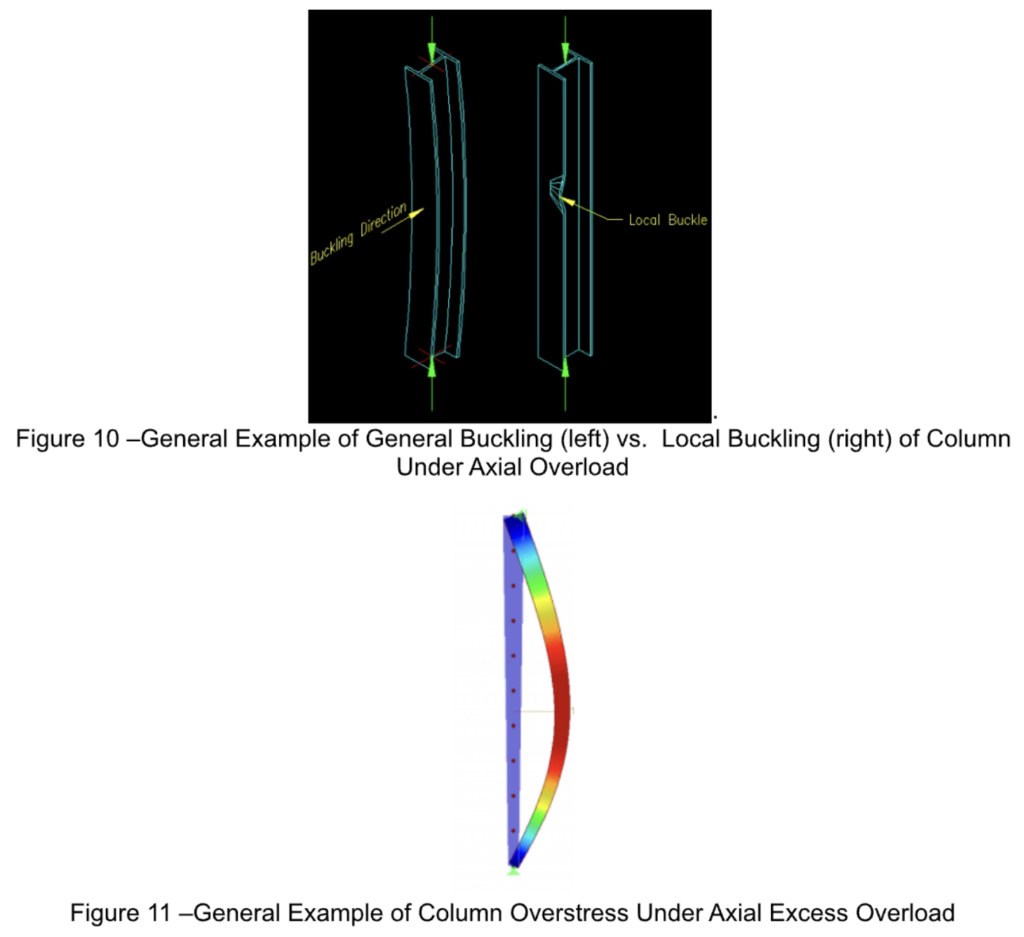 FEA analysis allowing for P-Delta effects was used to evaluate columns and girder beams. P-Delta analysis is a phenomenon in structural engineering in which the interaction between axial loads and lateral displacement results in increased forces and moments experienced by the member. This effect commonly occurs in columns overloaded in the axial direction, resulting in general buckling. An example of general buckling is provided the figures below. FEA analysis assuming linear elastic analysis (no P-Delta effects) was utilized determine reaction loads for joists.