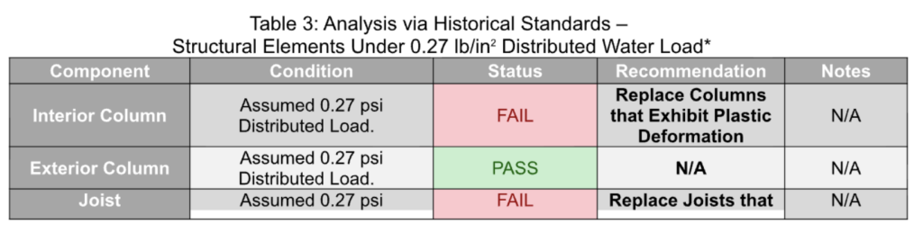 Additionally, the lack of verified engineering design for the existing column system suggests that reserve capacity is minimal. Over time, this condition could contribute to progressive load redistribution, resulting in distress to roof framing connections or adjacent columns. In extreme cases, localized column failure could lead to partial roof collapse or disproportionate structural damage.
